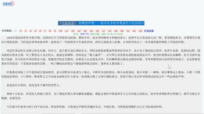 2005年12月30日,2006年1月13日,孫維用ID“孫維聲明”在天涯社區發布了兩篇長文澄清自己的嫌疑,“98年8月,公安14處宣布解除對我的嫌疑,他們承認沒有任何證據證明我和朱令中毒有關。”